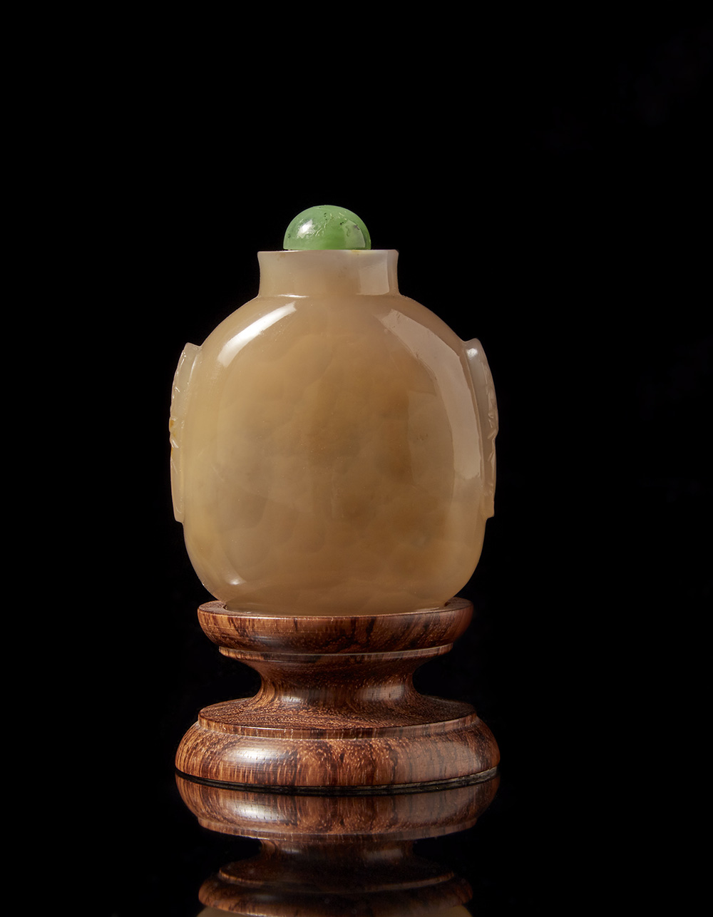 Snuff bottle in calcedonia con anse a mascheroni, con coperchio, base in legno