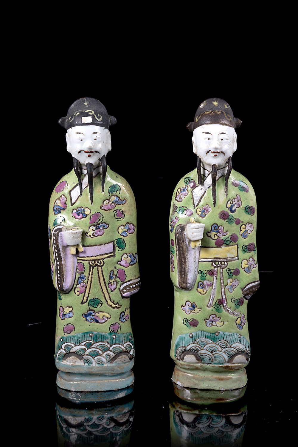 A pair of officials in biscuit decorated with polychrome enamels (defects)