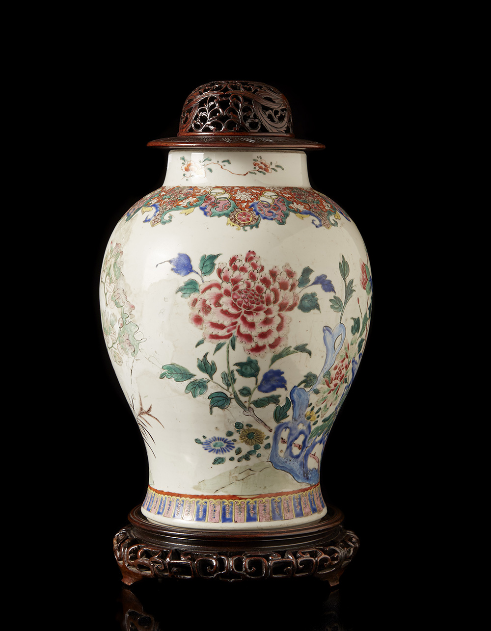 Vaso in porcellana con coperchio in legno e base in legno (difetti e restauri)