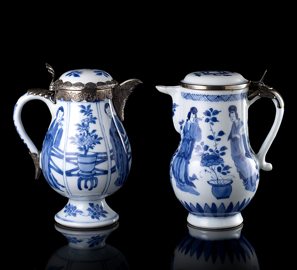 Due piccole brocche in porcellana bianca e blu, decorate con figure femminili e motivi floreali, con montatura in argento. La porcellana,