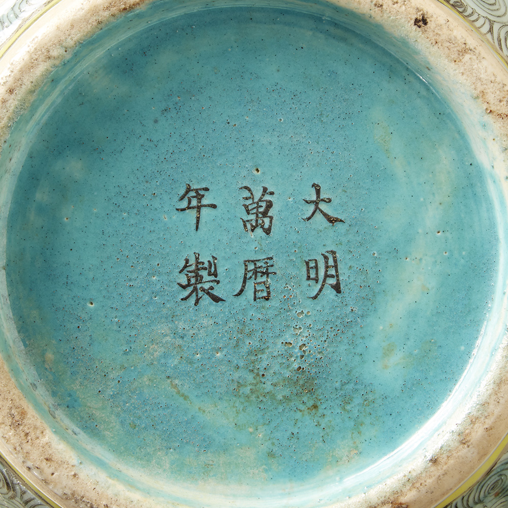 Vaso rouleau in porcellana Famiglia Rosa con decoro in rilievo raffigurante pesci e fauna acquatica, marchio apocrifo Wanli alla base
