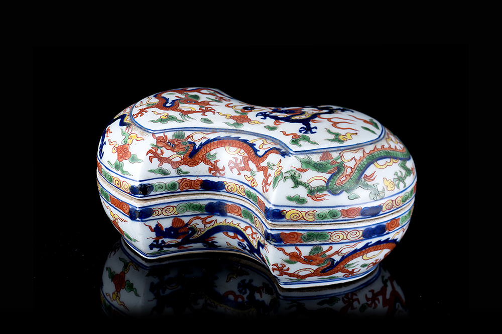 Scatola in porcellana wucai a forma di lingotto con decoro in stile Ming,...