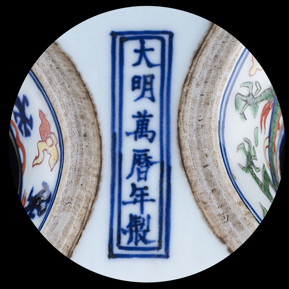 Scatola in porcellana wucai a forma di lingotto con decoro in stile Ming, marchio apocrifo Wanli alla base