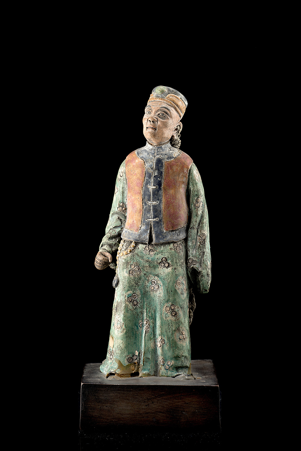 An enamelled biscuit model of an official, with wood base (with expertise) (defects)