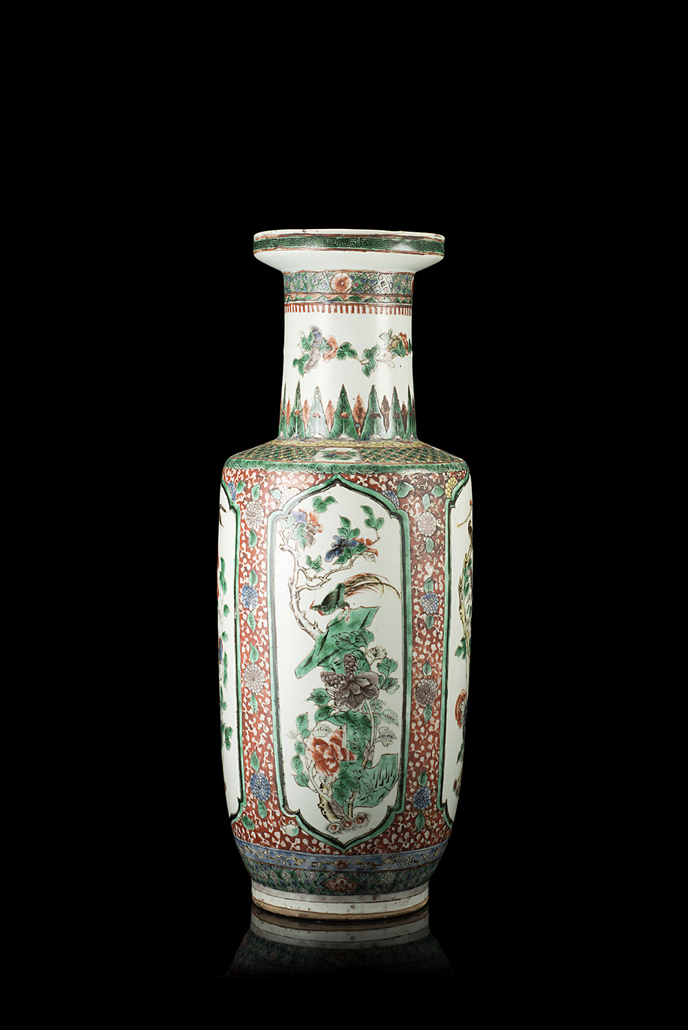 A large Famille Verte rouleau vase, decorated with floral motifs