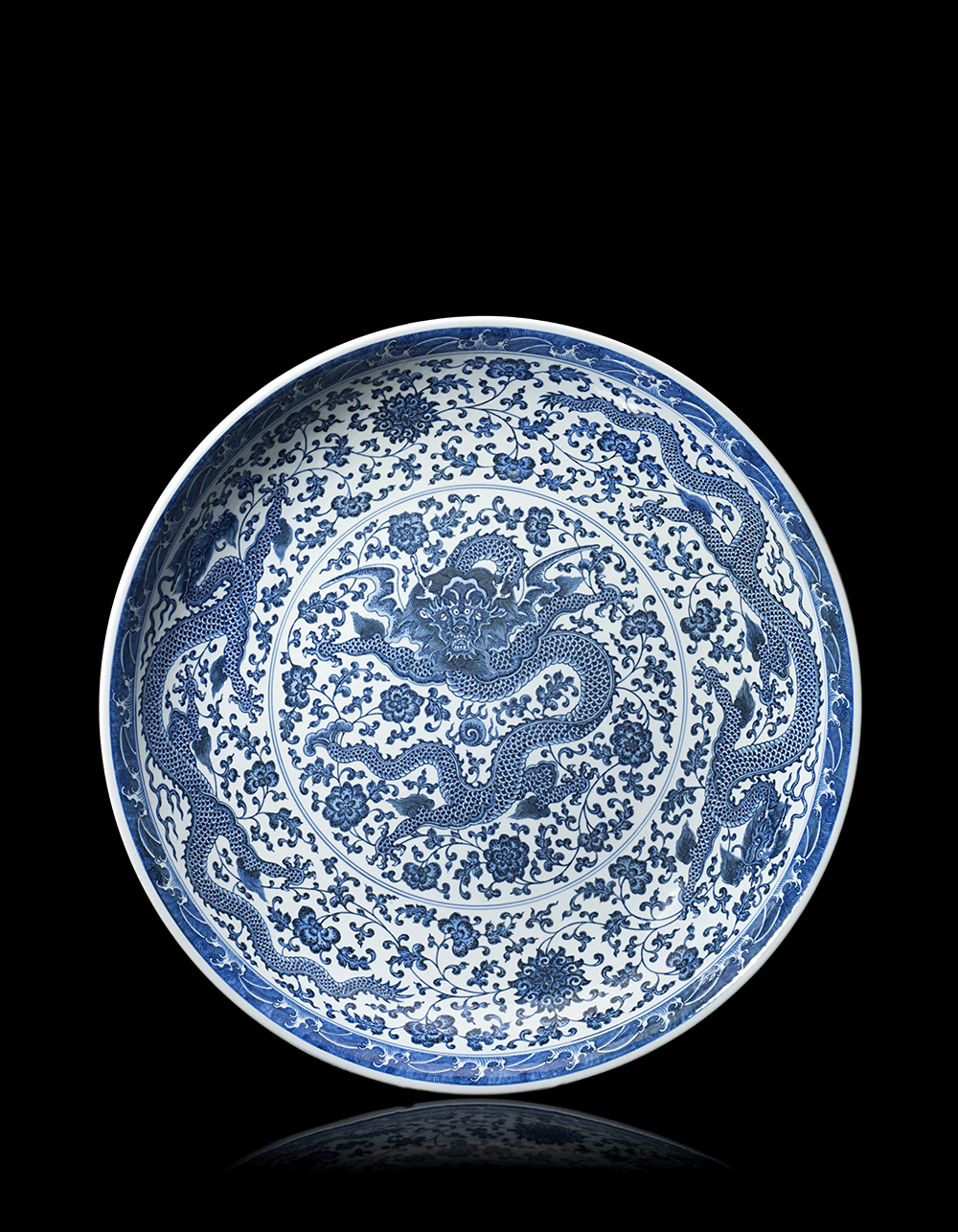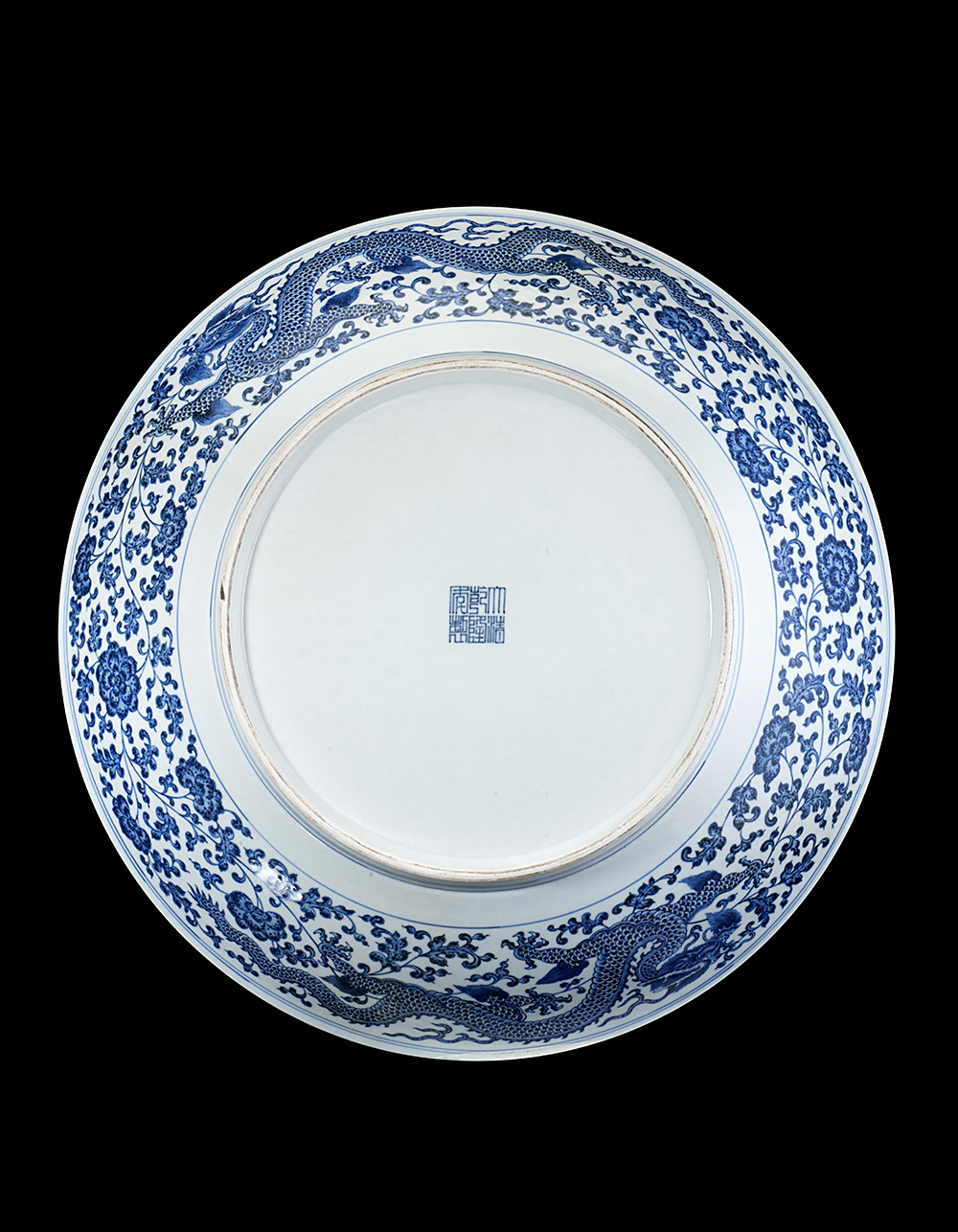 A large blue and white porcelain dish decorated with dragons and floral motifs, with an apocryphal Qianlong mark to the base