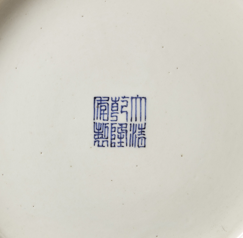 Grande piatto in porcellana bianca e blu decorato con draghi e motivi floreali, la base con marchio apocrifo Qianlong