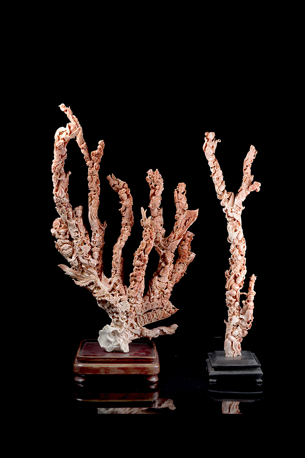 Two pink coral branches carved and pierced with ladies and birds, wood bases (defects and restorations)