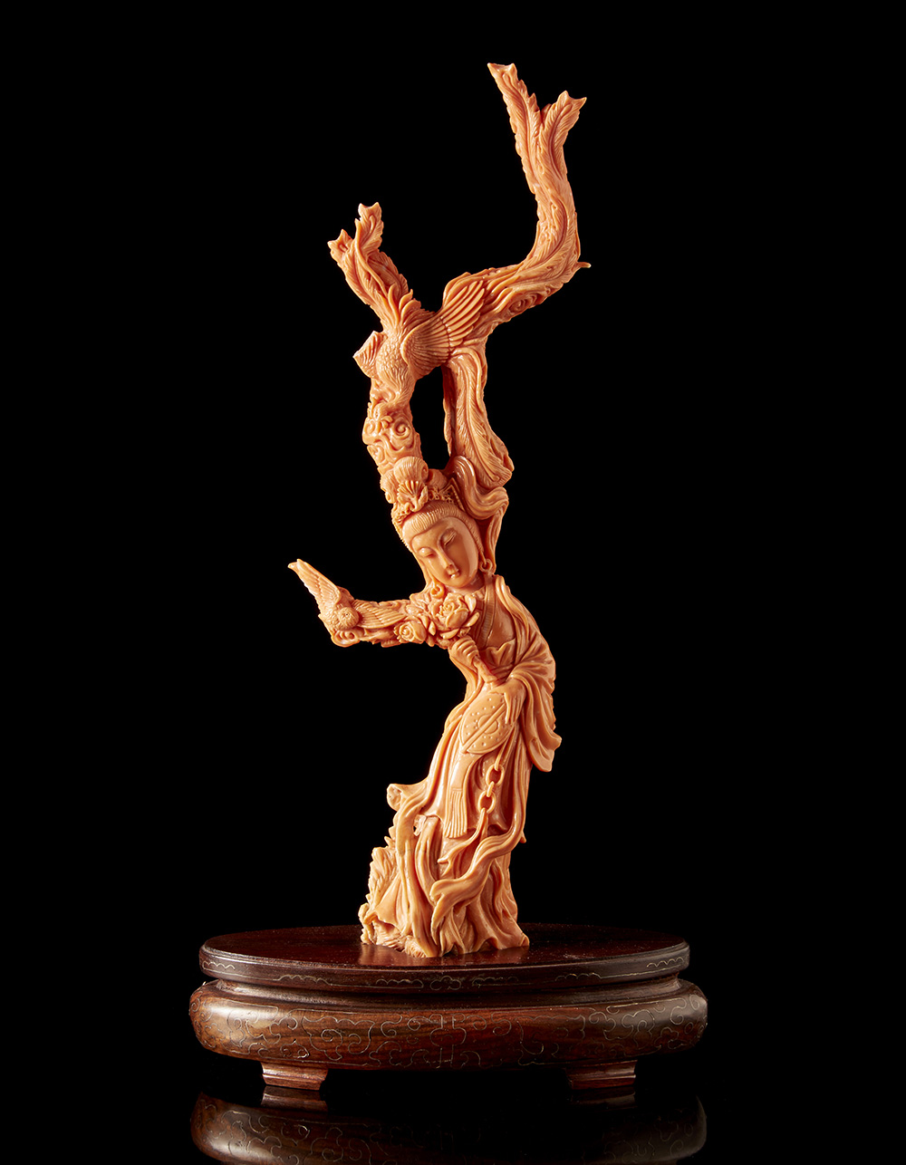 A coral branch carved with a lady wearing long robes, carrying peonies, accompanied by a phoenix, wood basemovement signed