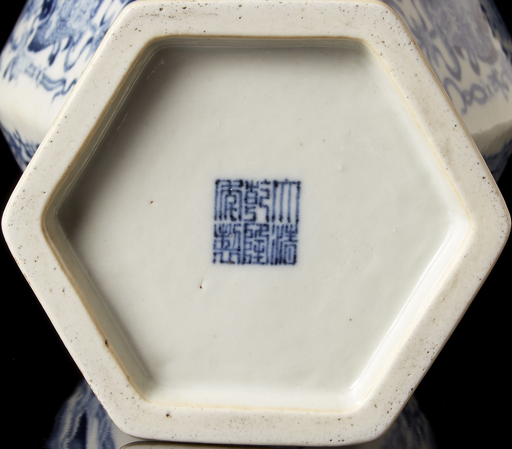 Vaso a balaustro esagonale in porcellana bianca e blu, di forma allungata, ciascun lato decorato con coppie di carpe sotto un tendaggio al di sopra di bande a foglie in stile arcaico e ulteriore bande a motivi decorativi, il collo con anse a guisa di draghi stilizzati, decorato con caratteri shou stilizzati tra motivi pendenti a teste di ruyie bande a motivi geometrici, alla base marchio apocrifo Qianlong