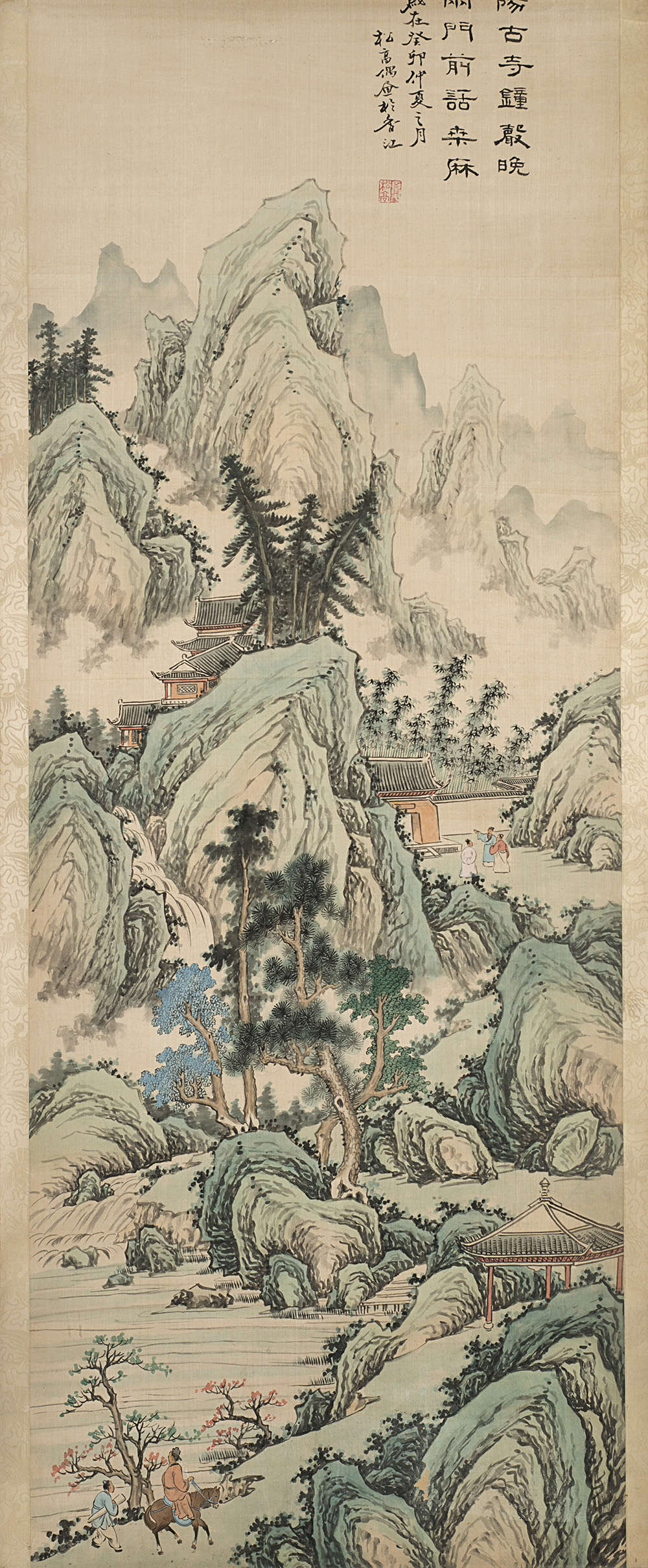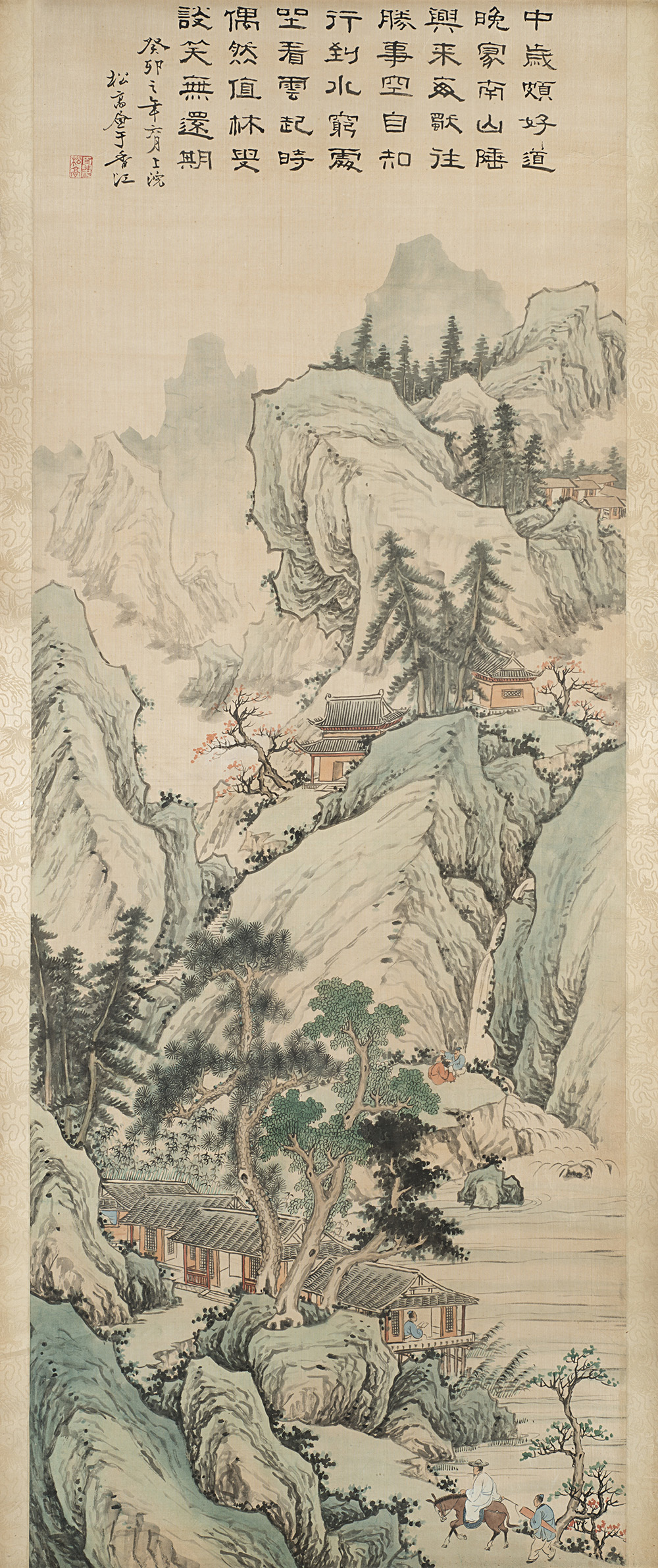 Coppia di dipinti inchiostro e colore su seta raffiguranti paesaggio montano, calligrafia e sigilli, montati su seta con cornice