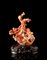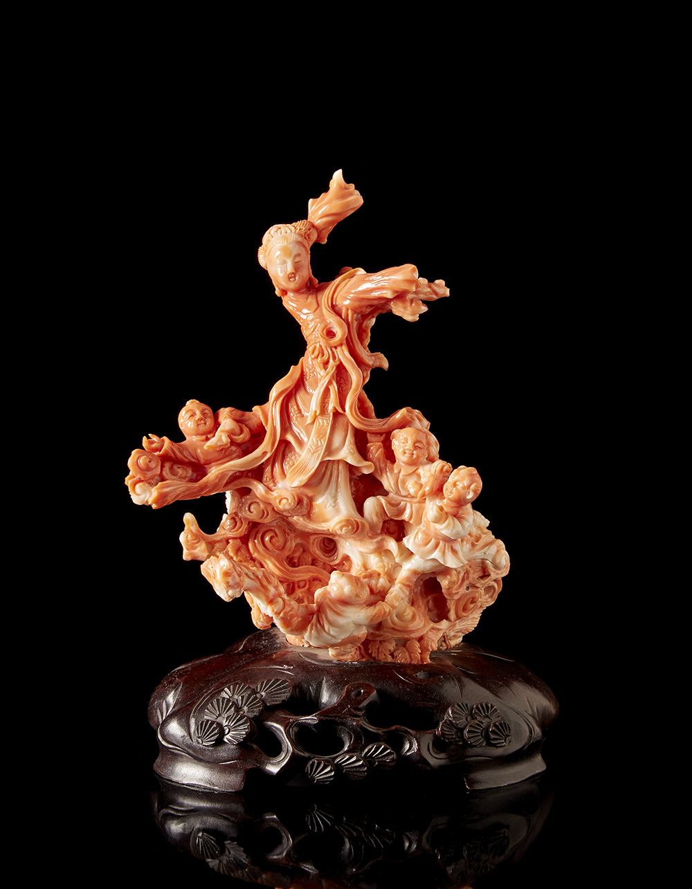 Ramo in corallo color rosa pallido scolpito con Guanyin e fanciulli, base in legno (difetti)