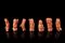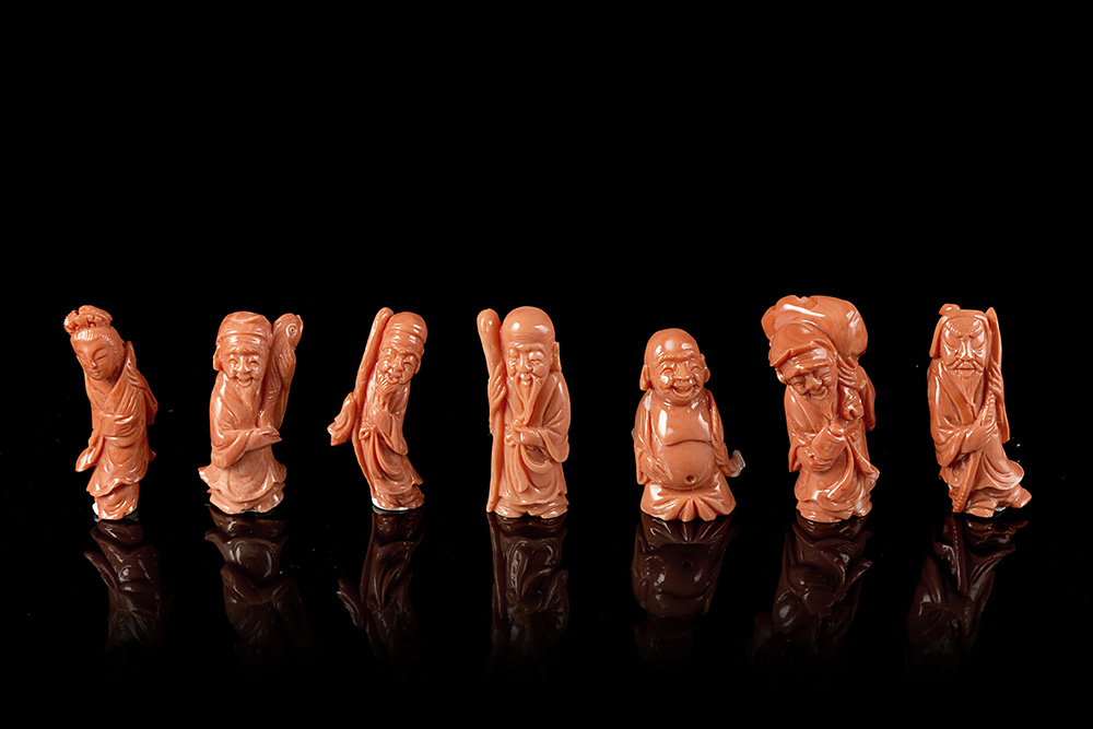 Sette piccole sculture in corallo raffiguranti le sette divinità della fortuna, in scatola originale