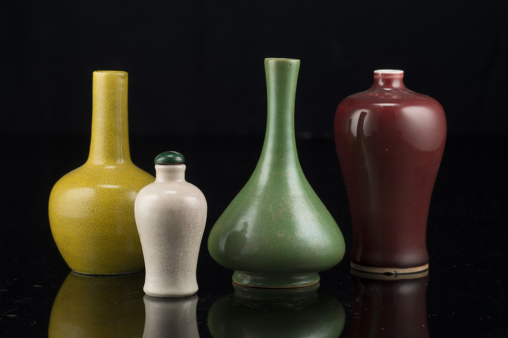 A group of four porcelain small vases, each with a different glaze tone