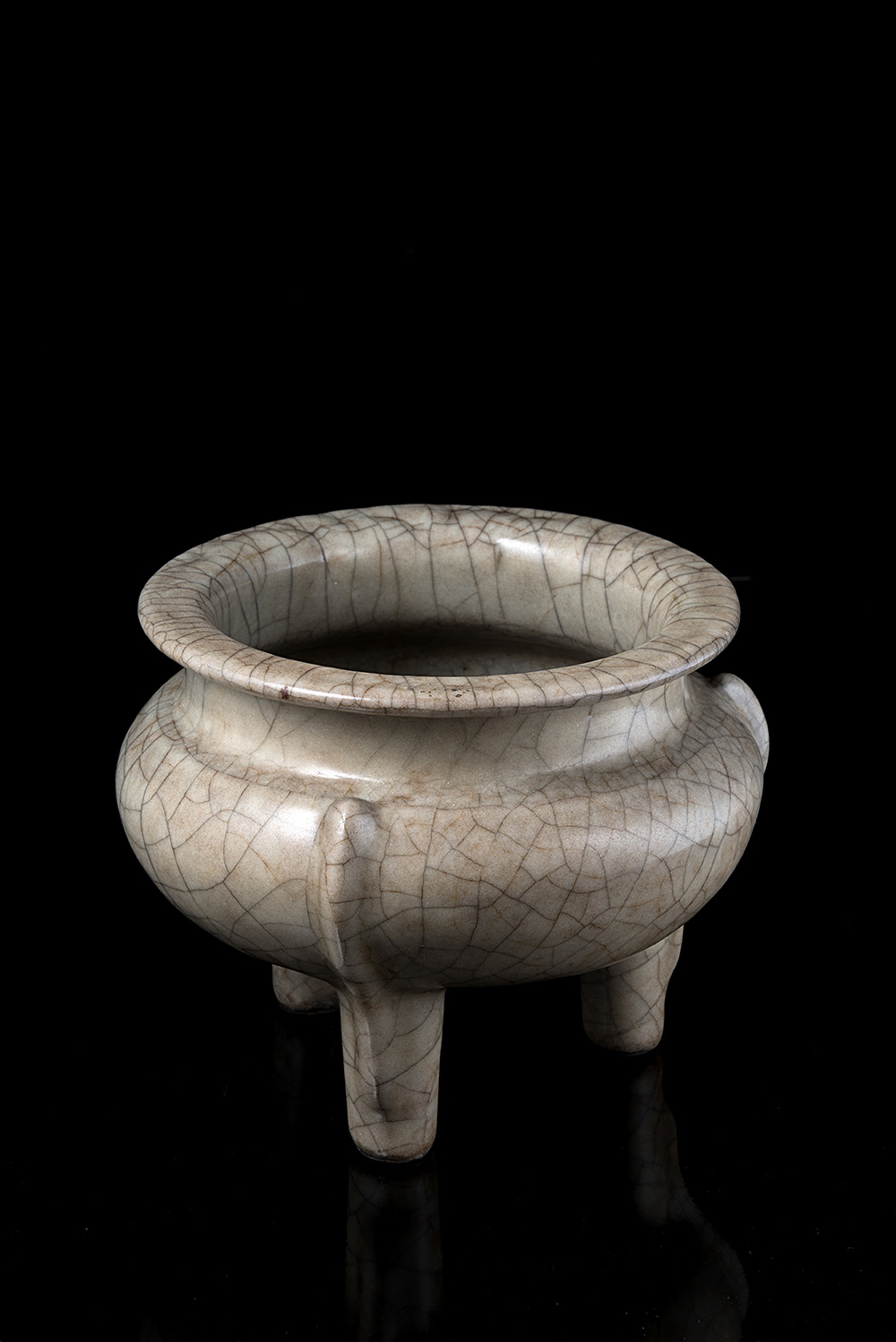 A guan-style tripod censer with a pale grey glaze and a fine craquelure