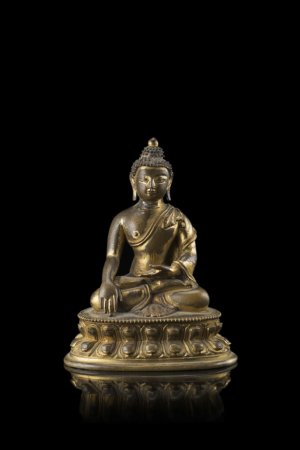 A gilt bronze figure of a Buddha seated in dhyanasana on a double lotus base, the hands in bhumisparsa mudra