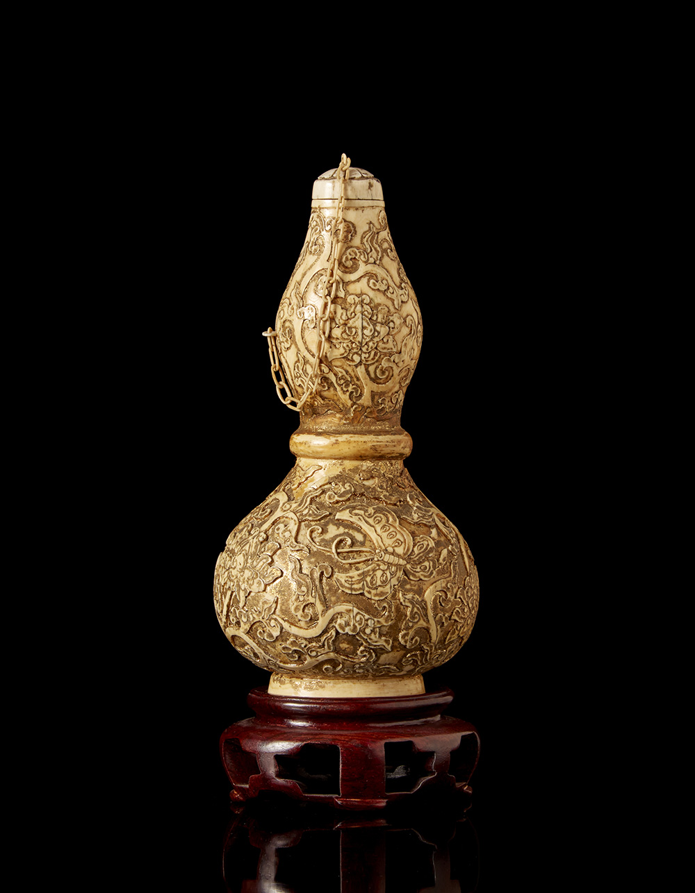 Vaso a doppia zucca in avorio con decorazione intagliata e tracce di doratura, base in legno (lievi difetti)