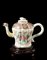 A Famille Rose porcelain teapot, wood cover and base (defects and restorations)
