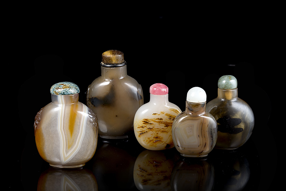 Cinque snuff bottles in agataCina, secolo XX(h. max 6,5 cm.)-ENFive agate...