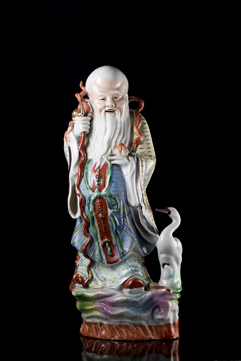 Shoulao dalla lunga barba in porcellana Famiglia Rosa, raffigurato in piedi su rocce, in mano una pesca ed un bastone, accompagnato da una gru