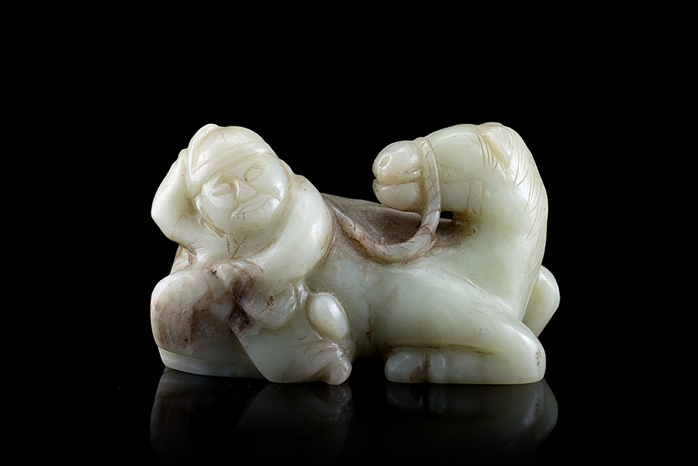 Lotto 230 | Gruppo in giada con fanciullo e cavalloCina, secolo XX(l. 13 cm.)-ENA jade...