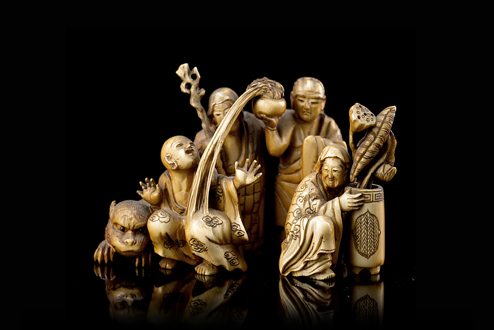 Okimono in avorio raffigurante un gruppo di personaggi leggendari