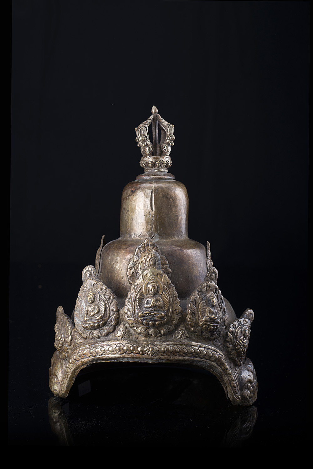 Copricapo in metallo dorato decorato con motivi floreali e geometriciTibet,...