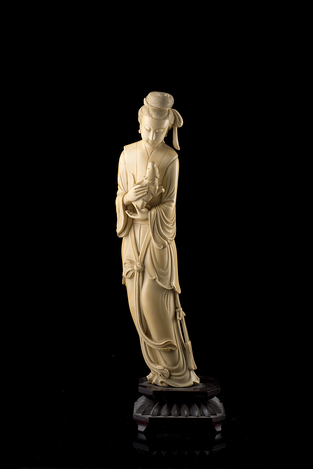 Lotto 247 | Scultura in avorio raffigurante dama dalle lunghe vesti con cucciolo di cane,...