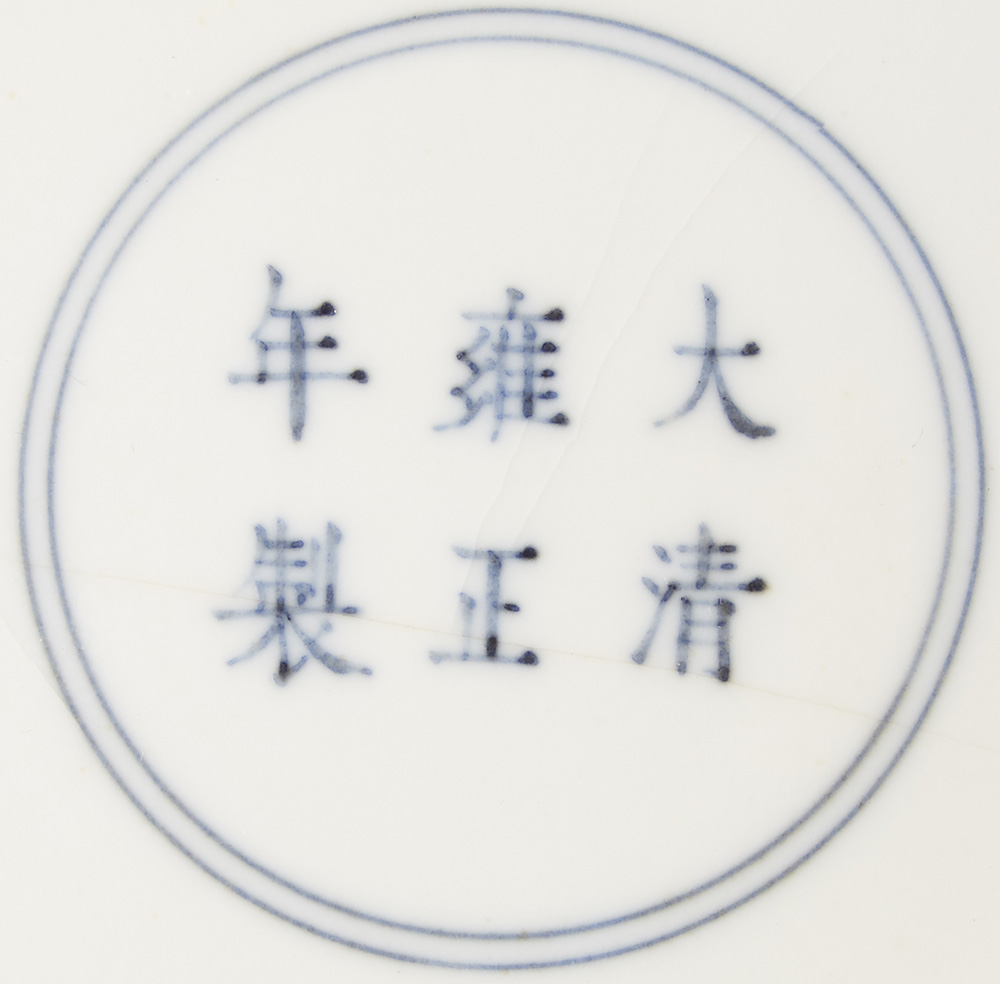 Piatto circolare in porcellana Famiglia Rosa con decoro floreale, marchio apocrifo Yongzheng (difetti)