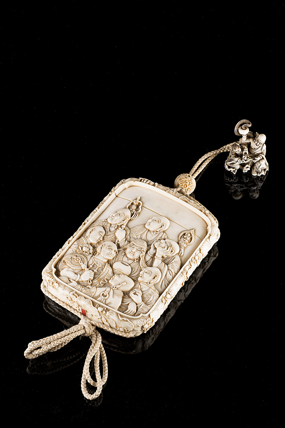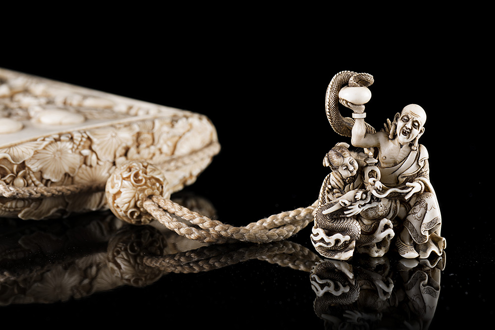 Grande inro in avorio, scolpito con monaci Buddhisti, firmato Mitsutoshi in cartiglio rosso, accompagnato da netsuke in avorio raffigurante monaco e drago firmato Gyokusan alla base