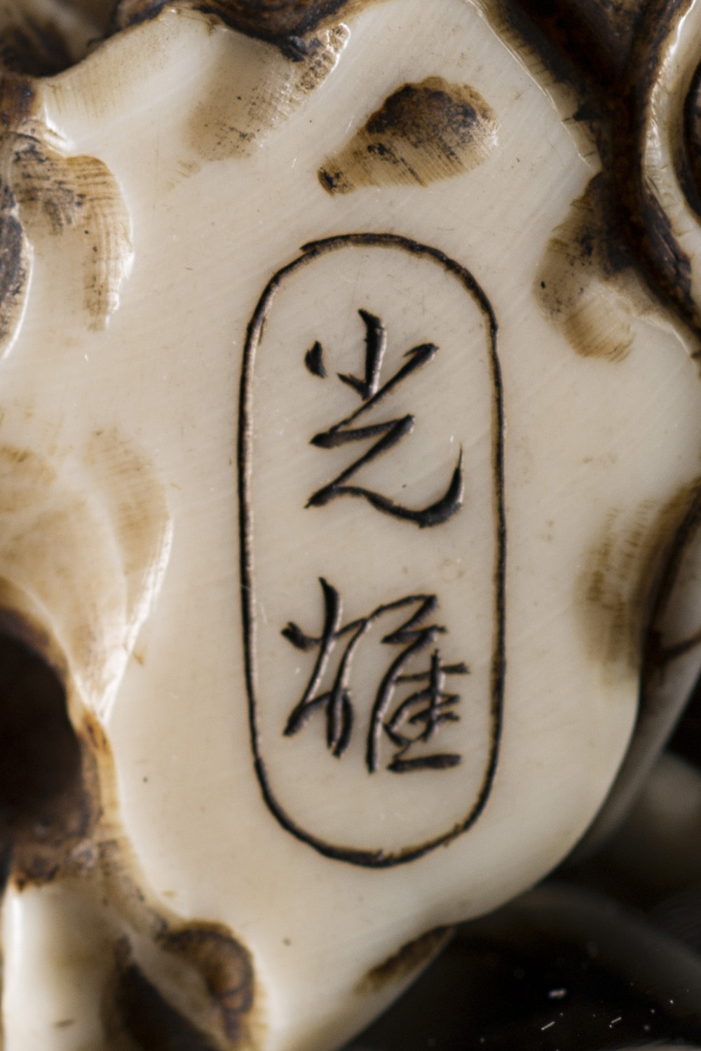 Grande inro in avorio, scolpito con monaci Buddhisti, firmato Mitsutoshi in...