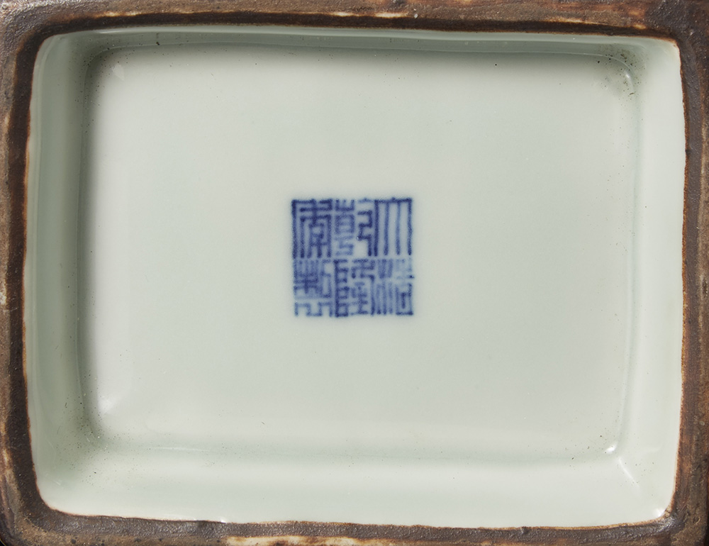 Piccolo vaso a balaustro dalla forma squadrata a invetriatura celadon e blu sottocoperta, marchio apocrifo Qianlong alla base