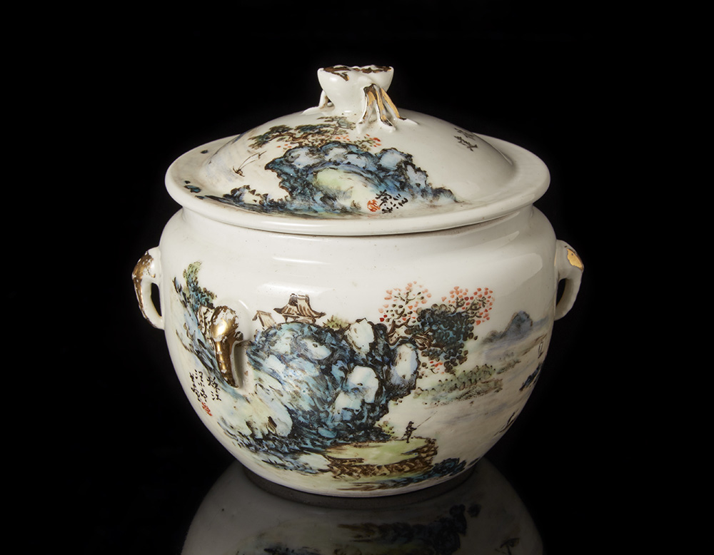 A small potiche and cover with polychrome decoration of a landscape, with calligraphy and seals