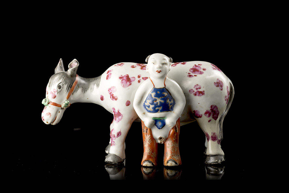 A polychrome-enamelled porcelain group depicting a boy and a horse (restorations)
