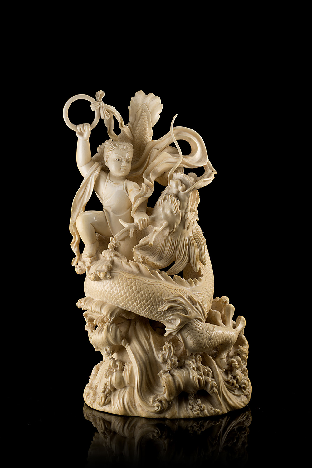 An ivory sculpture of a boy riding a dragon on foaming waves