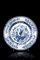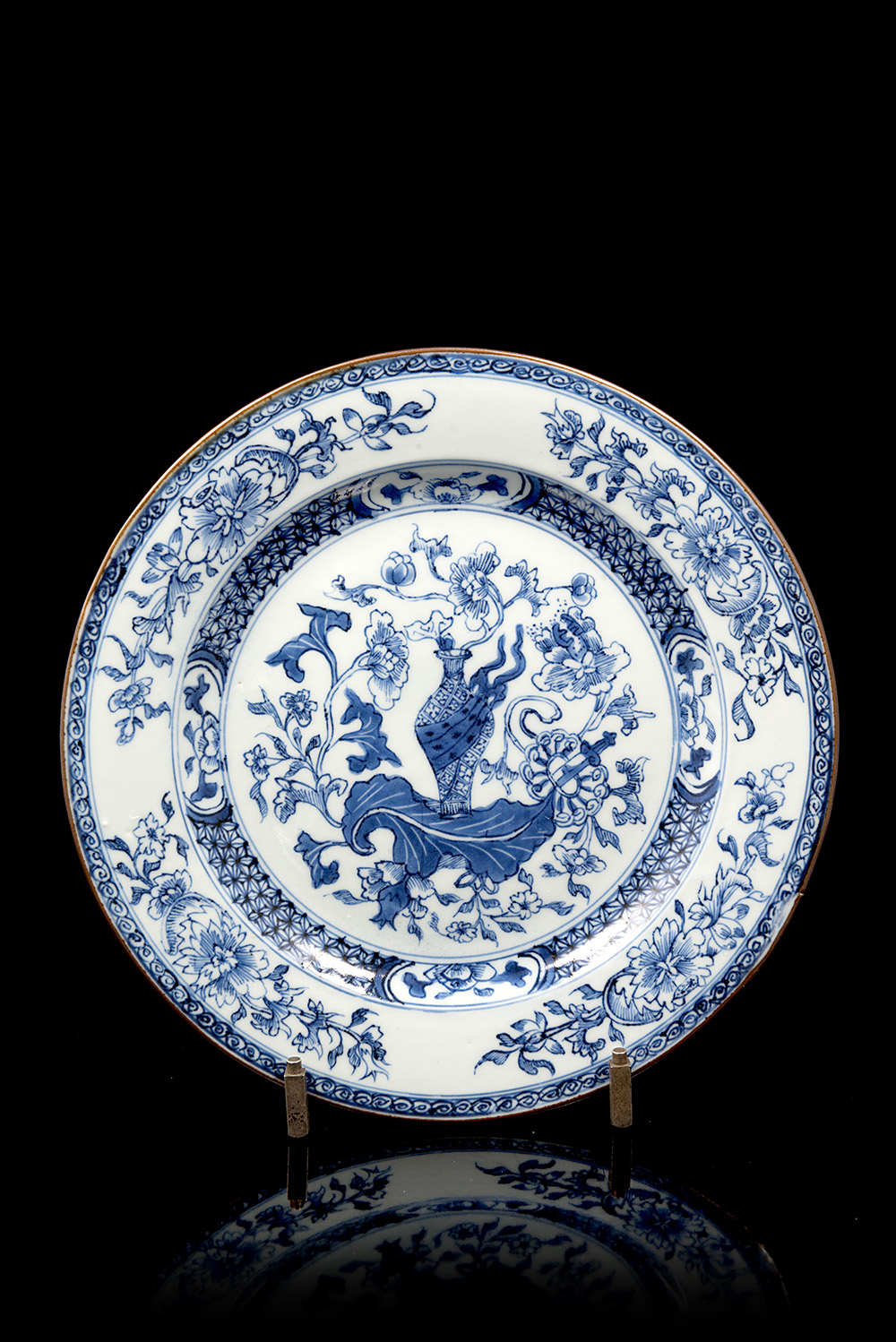 Piatto in porcellana bianca e blu decorato con vaso tra fiori di peonia, il cavetto con bordatura geometrica