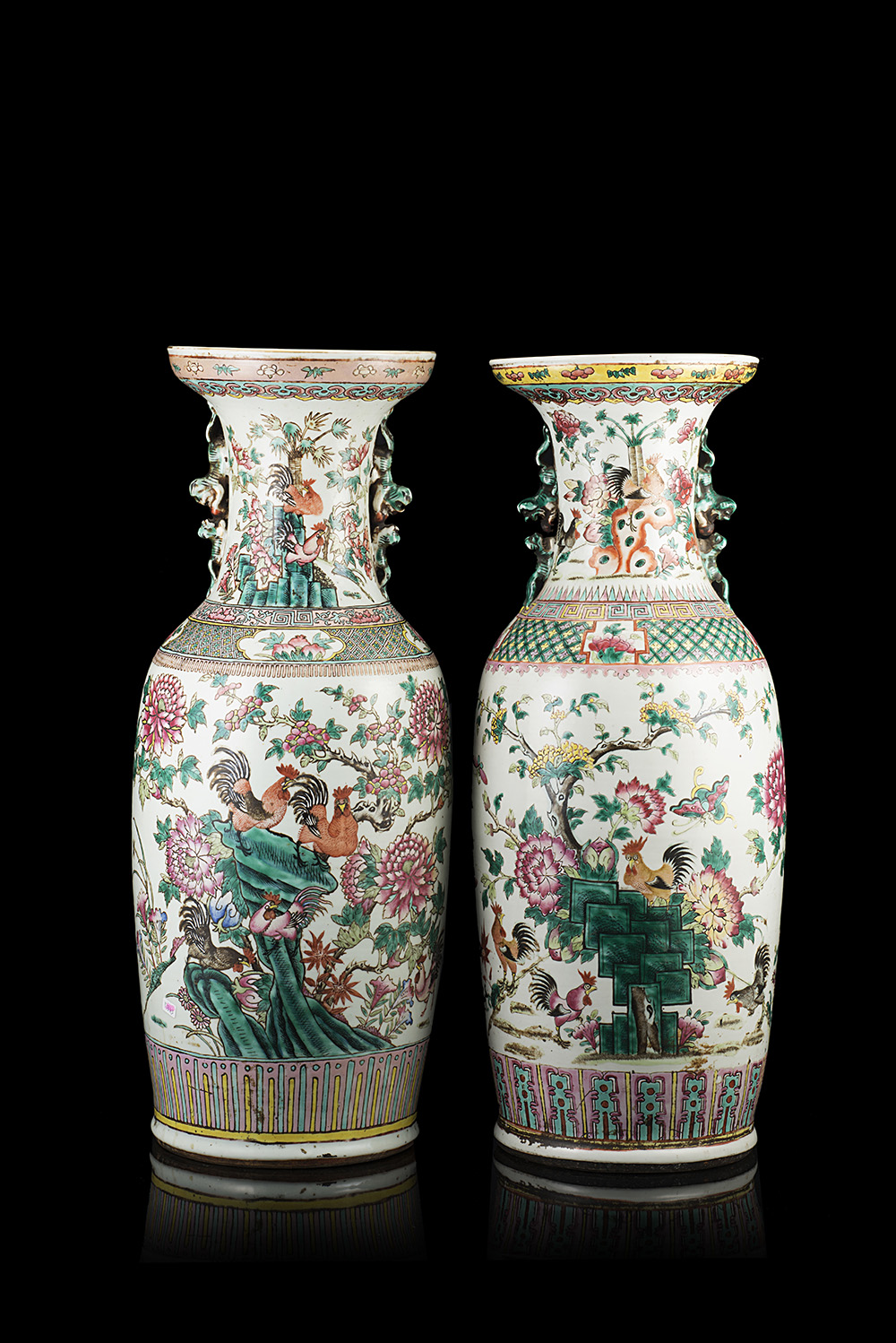 Due vasi biansati in porcellana Famiglia Rosa con anse a guisa di leoni buddhisti decorati con galli e peonie, basi in legno