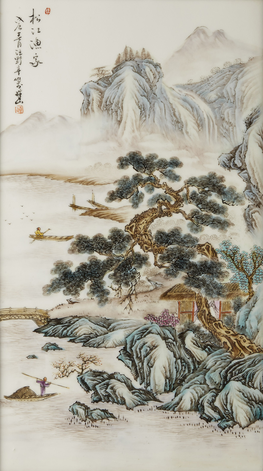 A polychrome-enamelled rectangular porcelain plaque decorated with a river and mountain landscape scene, with calligraphy and seals, with frame (slight defects)