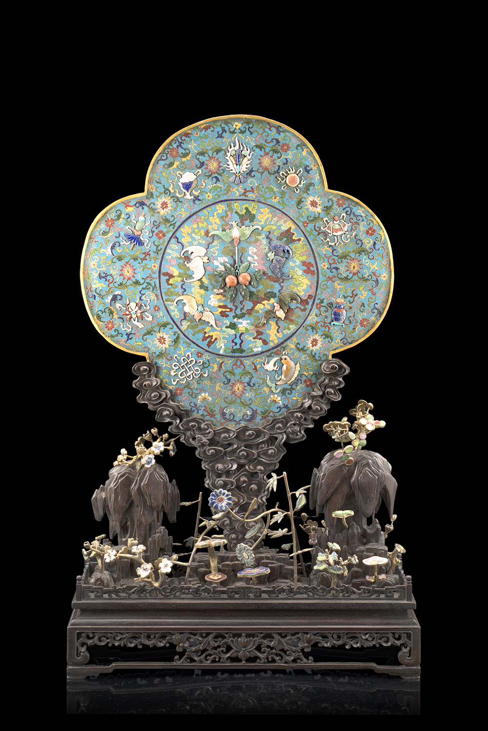 Placca quadrilobata in metallo cloisonné a decoro floreale su fondo turchese con applicazione in pietre dure e madreperla raffigurante gli Otto Emblemi buddhisti 'bajixiang', con base in legno scolpito a guisa di montagne e decori floreali in metallo dorato e smaltato (difetti)