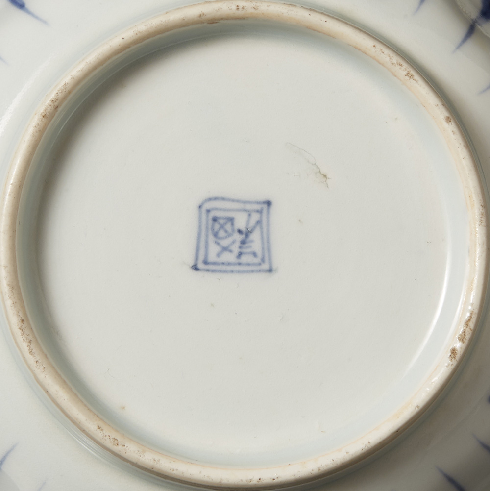 Quattro ciotole in porcellana bianca e blu decorate con pescatori