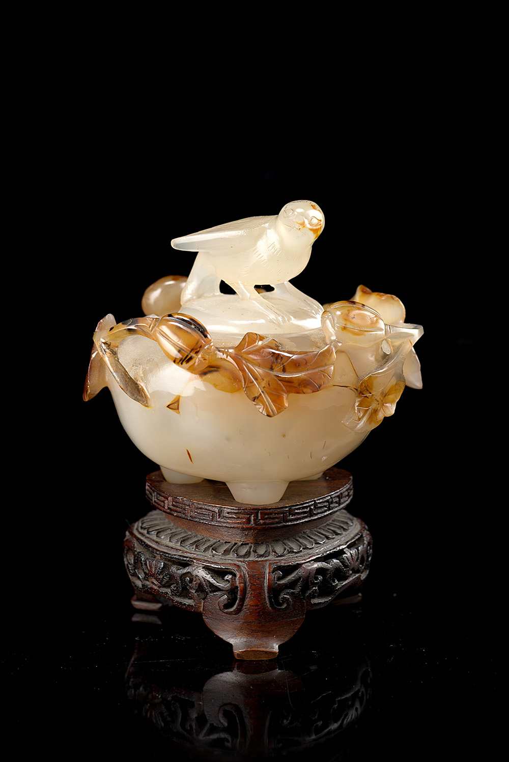 Bruciaincenso in agata, scolpito con foglie e fiori, con coperchio decorato con uccellino, base in legno (difetti e restauri)