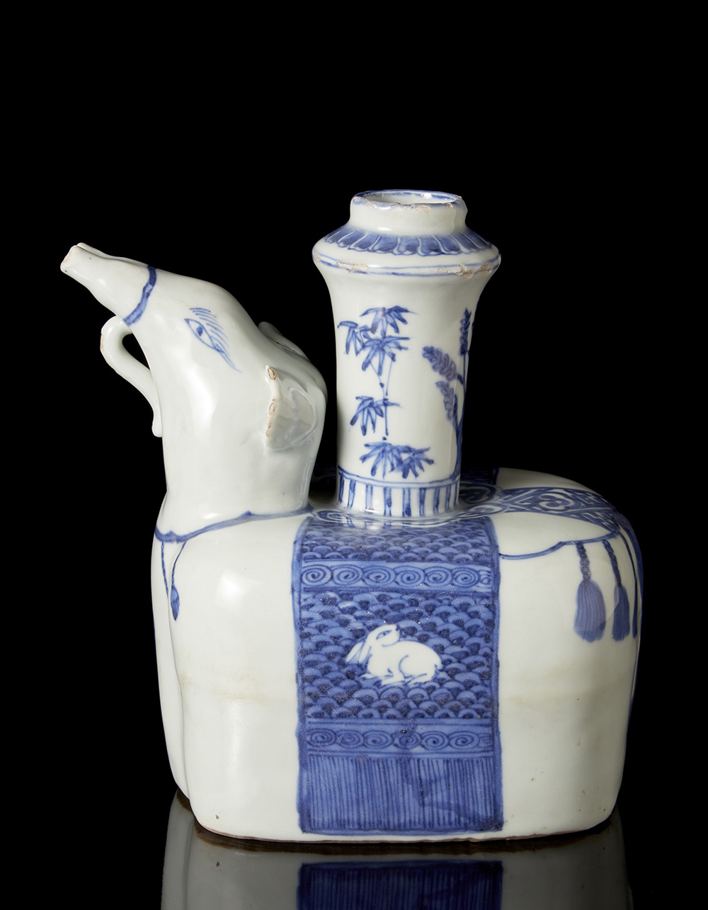 Versatoio 'kendi' in porcellana bianca e blu a forma di elefanteCina, secolo...