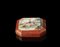 Piccola scatola ottagonale in porcellana policoma decorata con fanciulli su fondo color corallo con dorature, marchio apocrifo Qianlong alla base (lievi difetti)