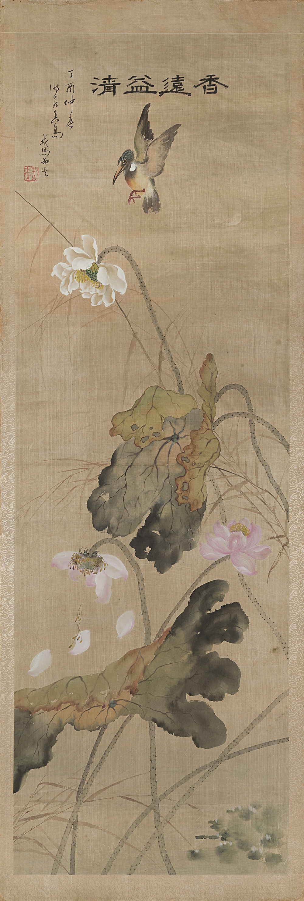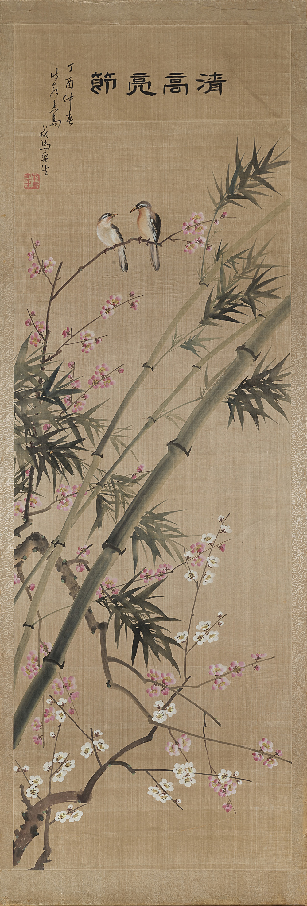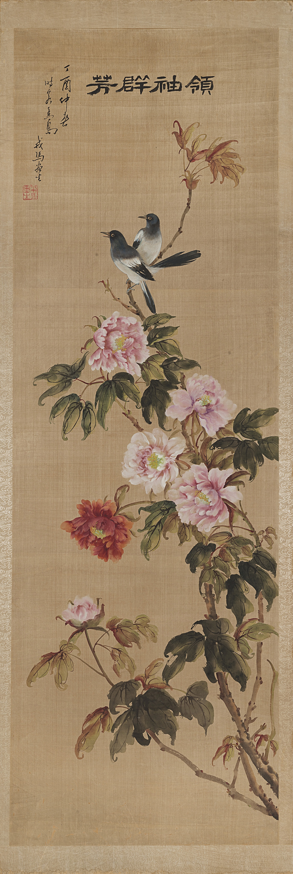 Four panels depicting flowers of the four seasons, with calligraphy, ink and colours on silk, framed and glazed
