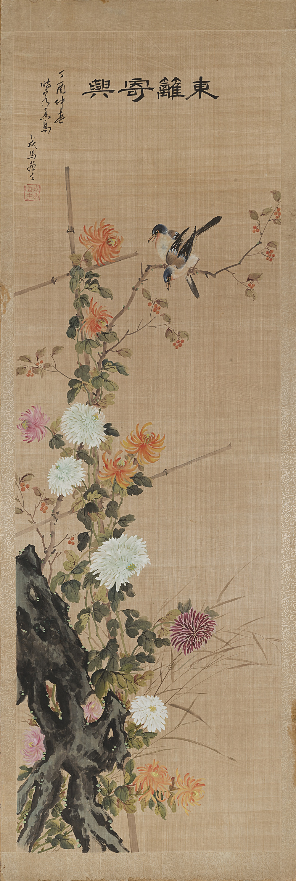 Quattro pannelli dipinti con i fiori delle quattro stagioni con iscrizione calligrafica, inchiostro e colore su seta, con cornice
