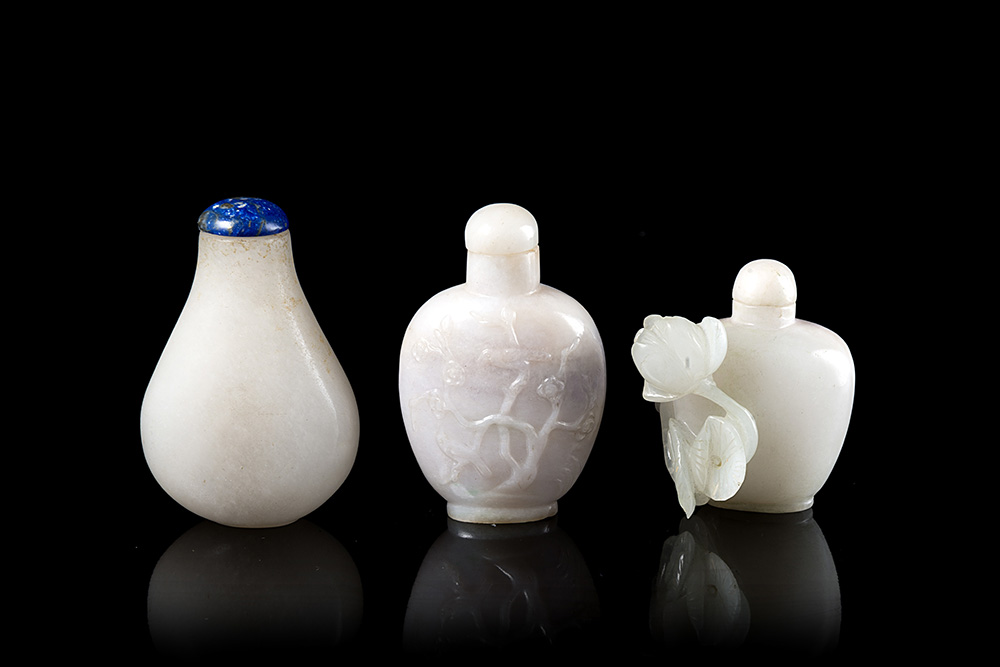 Tre snuff bottles in giadeite e pietra duraCina, secolo XX(h. max 6...