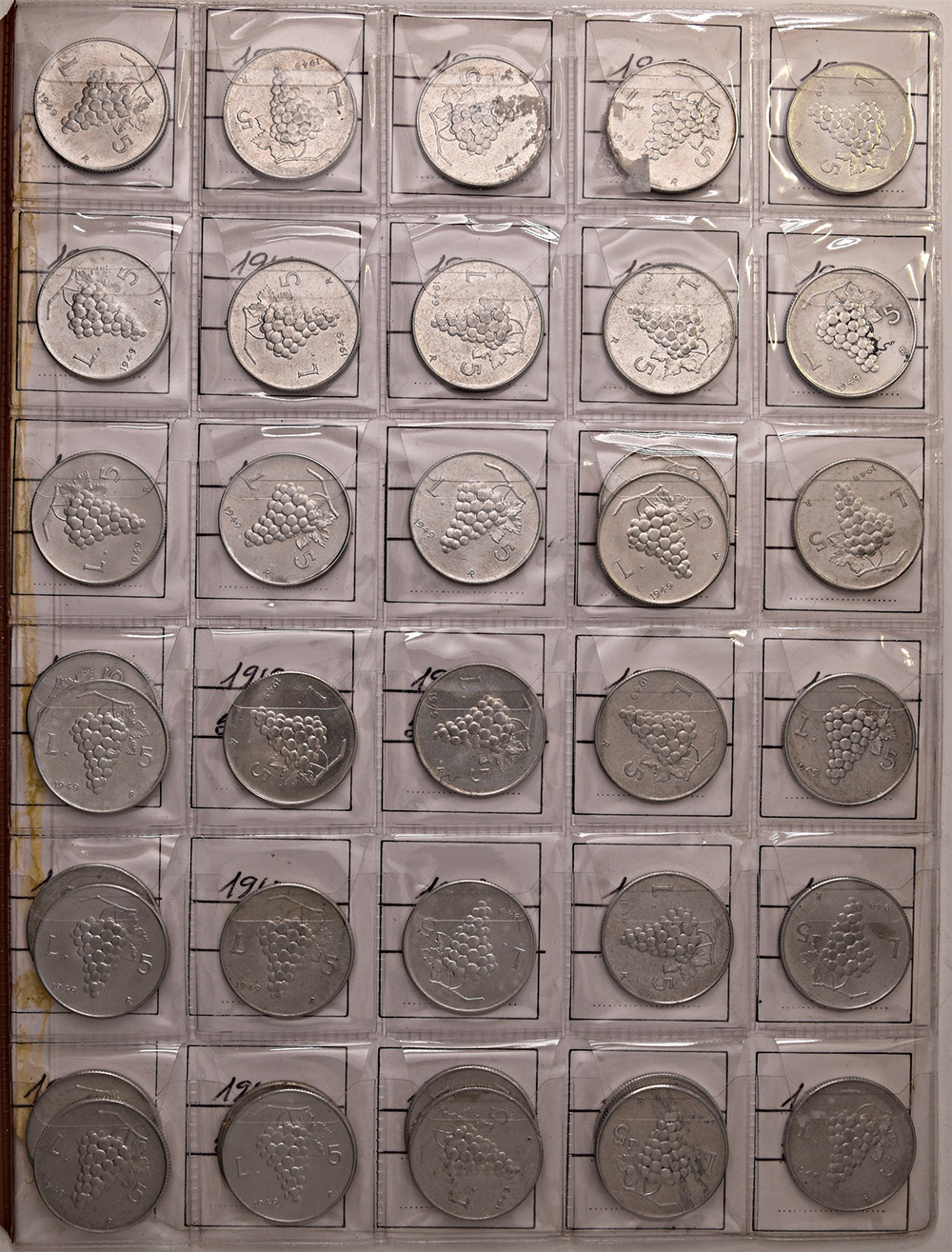 REPUBBLICA ITALIANA. Circa 368 monete dal 1948 al 1959: 151 da una lira, 42 da 2 lire, 95 da 5 lire e 80 da 10 lire (2 del 1948). Italma. Conservazioni varie.