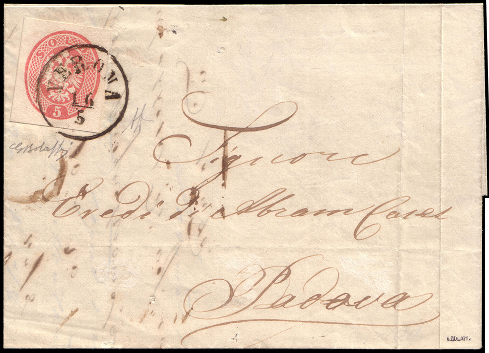 Lettera con testo da Verona per Padova, affrancata con un ritaglio di busta postale da 5s. rosa