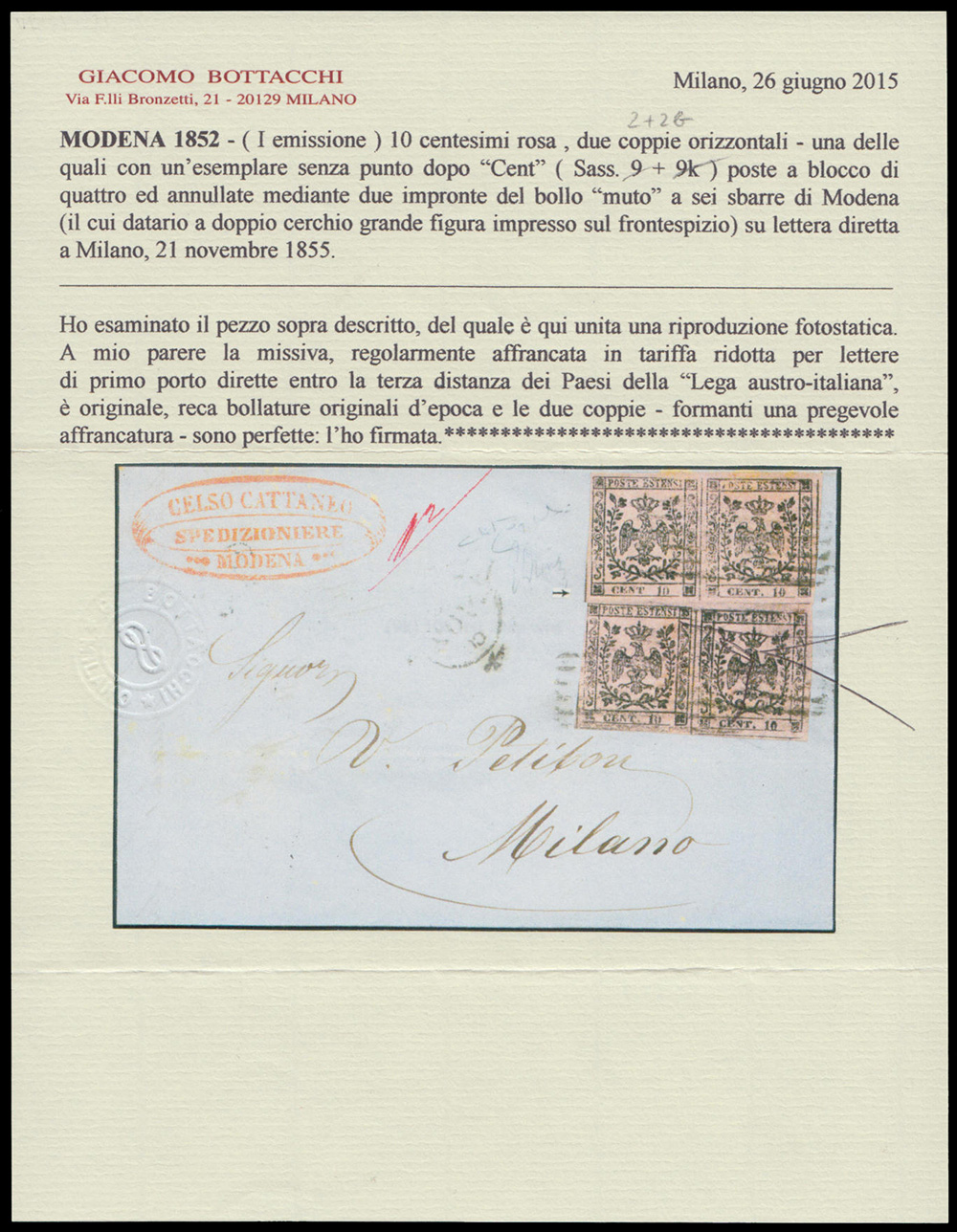 Lettera da Modena per Milano affrancata con 2 coppie del 10c. rosa, senza punto dopo le cifre, di cui uno senza punto dopo "CENT"