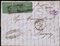 Lettera da Modena per Bologna affrancata con 3 esemplari del 5c. verde, con punto dopo le cifre di cui uno con varietà "CENT.5" (cifra ravvicinata), annullati da impronta a nove sbarre con scudo di Savoia